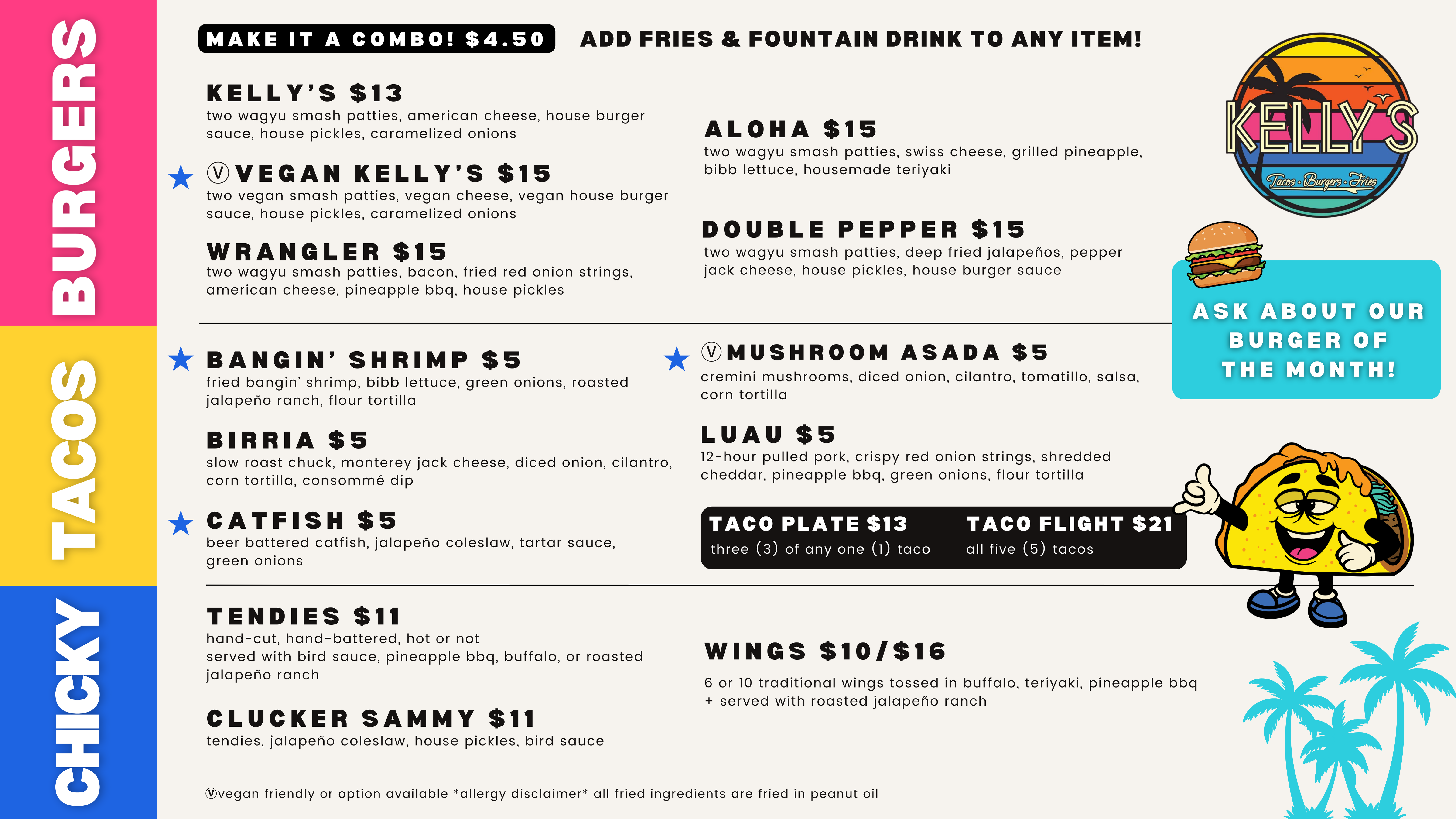 Discover the ultimate beachside flavor with our mouth-watering smashburgers, tantalizing tacos, and our signature Freaky Fries – loaded handcut fries like you've never tasted before. Fresh, trendy, and bursting with coastal vibes, every bite is a ticket to paradise. Dive in and taste the difference at Kelly’s!